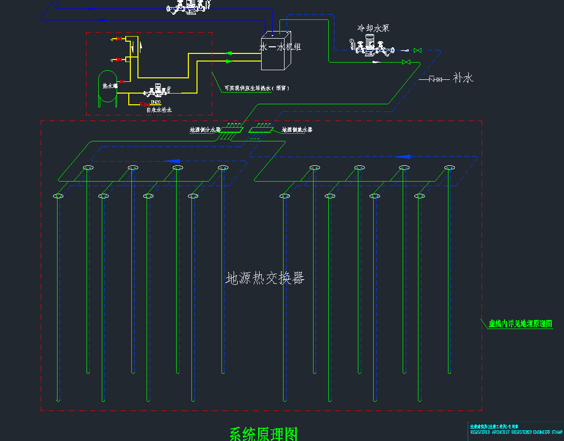 系统组成:地源热泵主机+磁悬浮离心式机组+模块式机房+风机盘管+全热回收式新风机+中央除湿+地板辐射采暖+全热回收式生活热水;